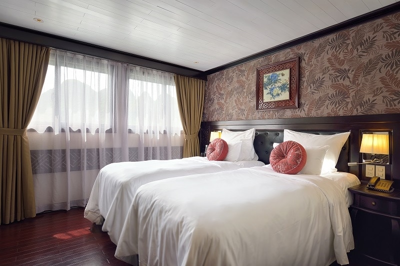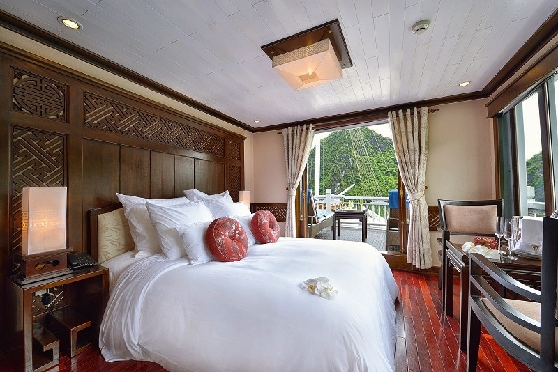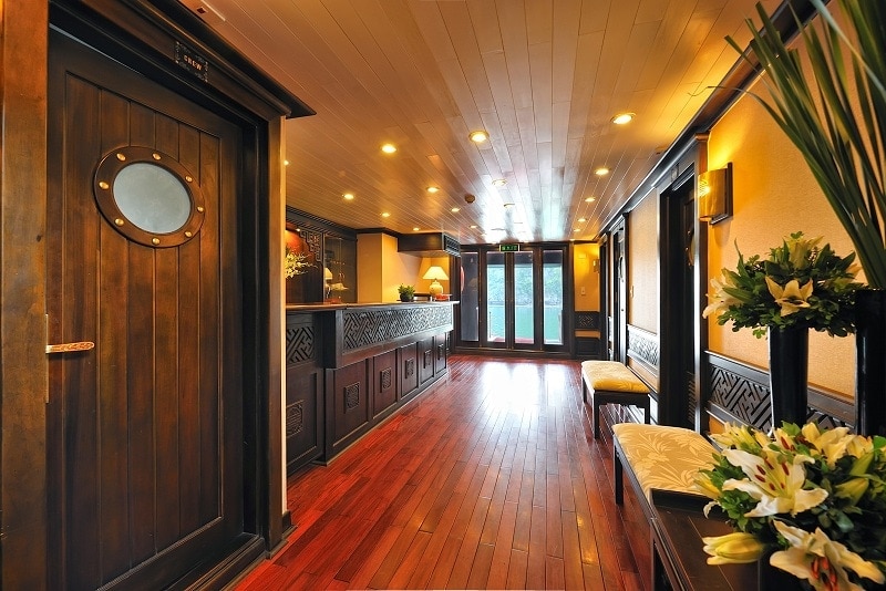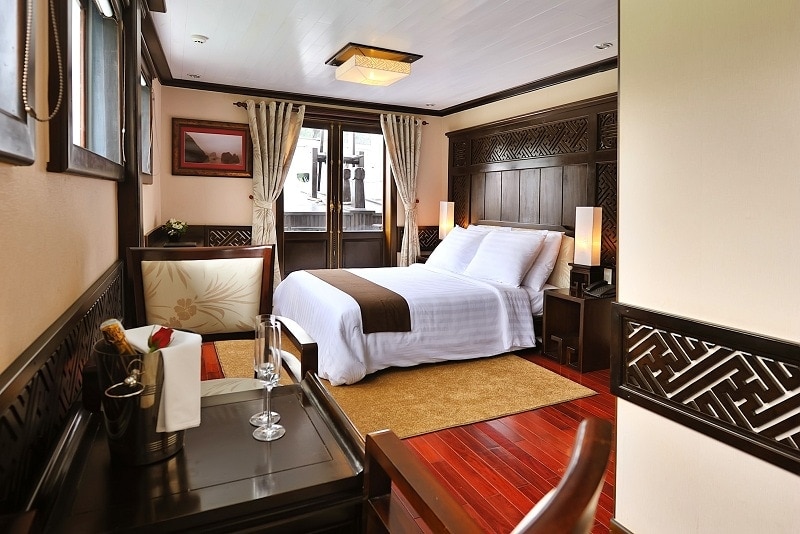 Each of the two Paradise Sails house 17 boutique cabins classically designed with a cozy, wooden interior that highlights the traditional design of the wooden junk cruise ship.