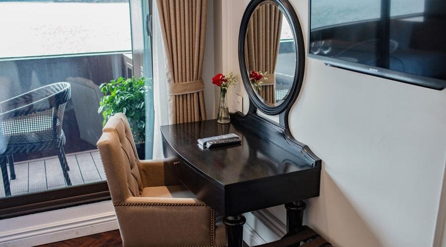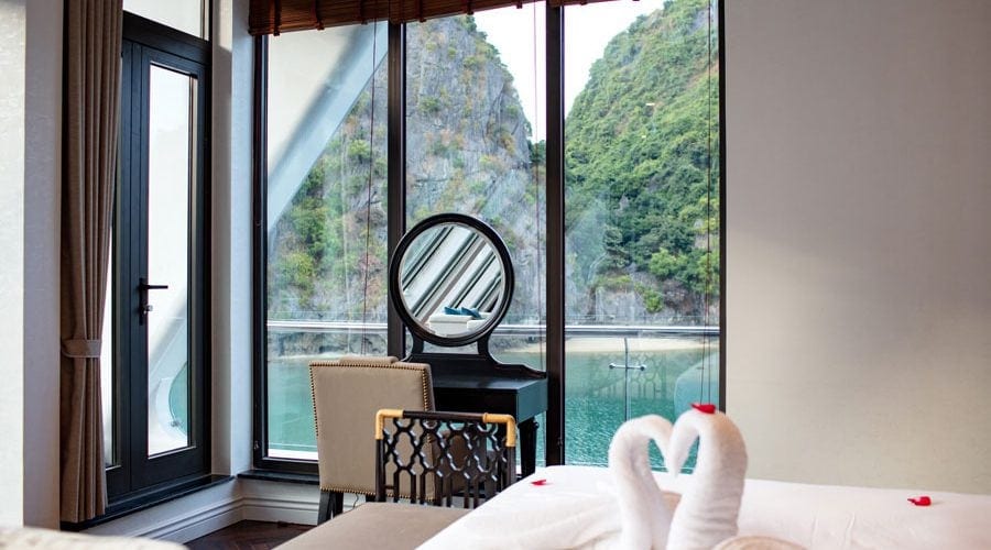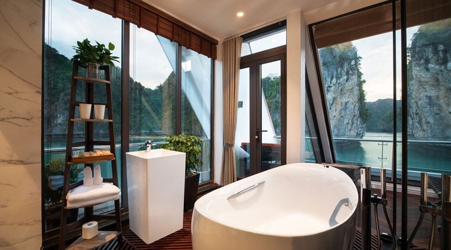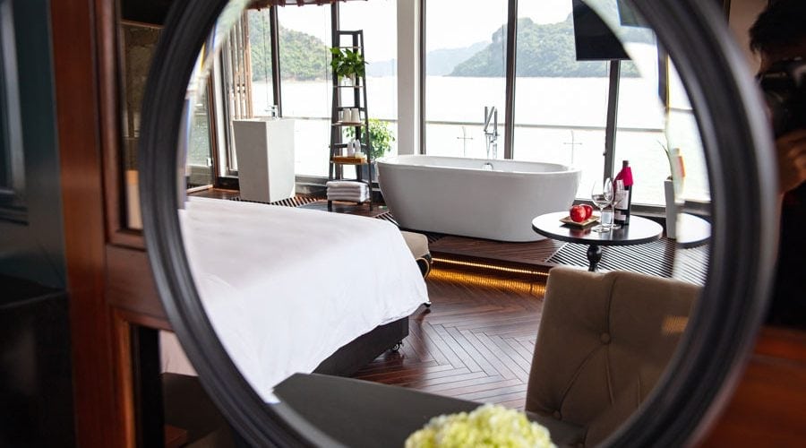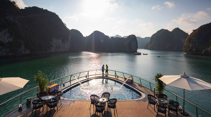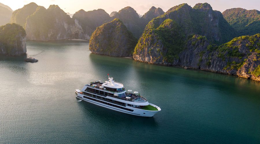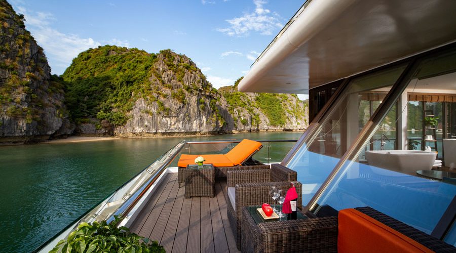 To be specific, the 1st deck is home to reception area, massage & spa and 11 Junior Suites with private balcony. The 2nd deck embodies 02 Executive Suites with private sun terrace, 08 Senior Suites with private balcony and a mini golf course. Meanwhile, a President Suite with large private sun terrace and other cruises’ amenities are set on the 3rd deck. Lastly, the 4th deck houses sundeck, lounge, rest room and operations room. Cabin facilities include mini bar, full finest bathroom amenities, free wife, complimentary water bottles, tea, coffee and snacks and 01 hour body massage.